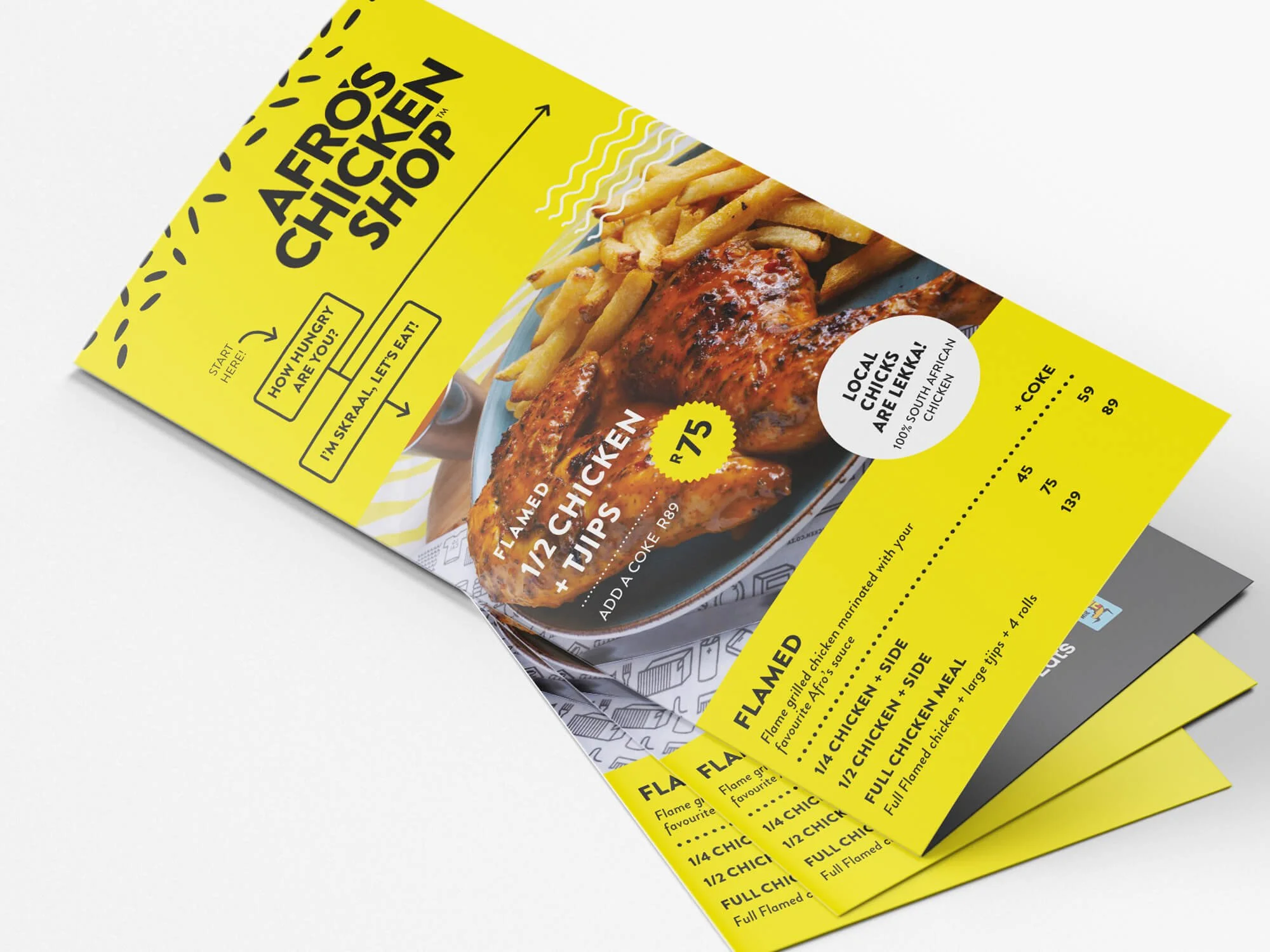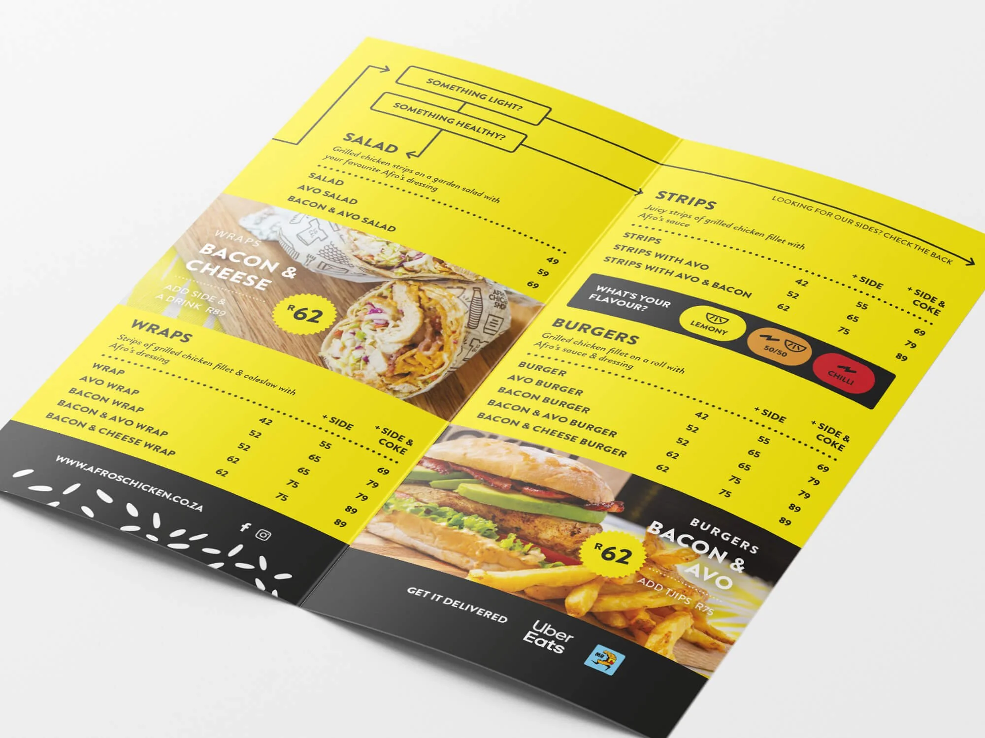 I was contacted by the team at Afro’s to provide them with a unique and creative menu solution, something that allowed the user to be interactive with the menu.